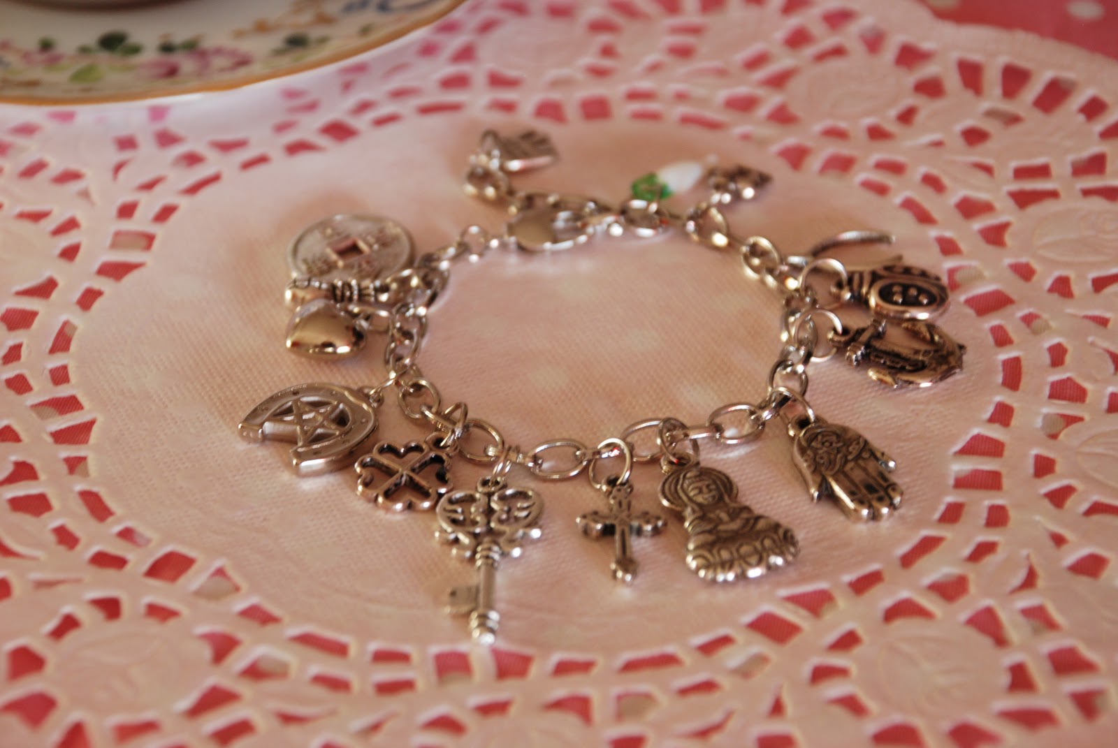 Porque nunca é de mais chamar a sorte e afastar o azar, esta pulseira agradável à vista reune numa peça só vários amuletos/talismãs* conhecidos (ou nem tanto).